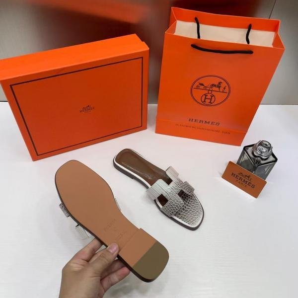 Hermes Paris Oran Flats Croc Leather White For Her With OG Box & Carry Bag White Slide