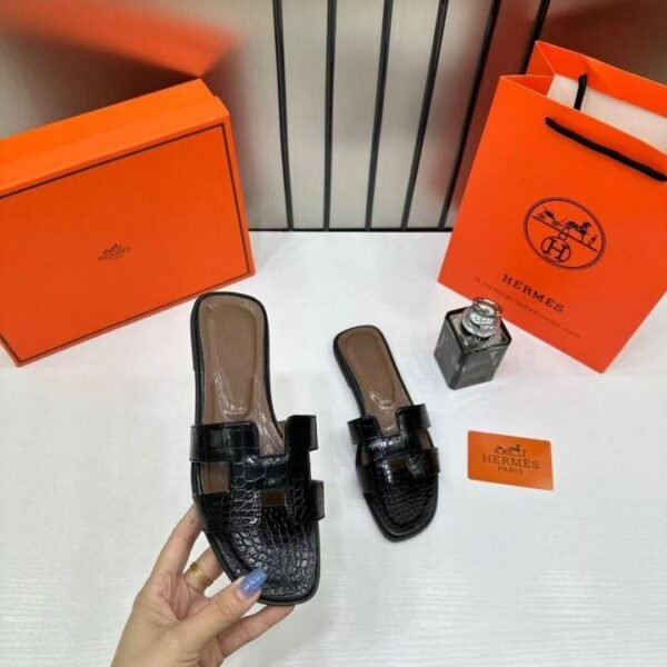 Hermes Paris Oran Flats Croc Leather Black For Her With OG Box & Carry Bag Black Slide