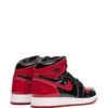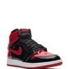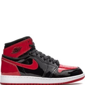 Black/red patent leather Air Jordan 1 Retro High sneakers from JORDAN featuring signature Air Jordan Wings logo, signature Swoosh logo detail, contrasting panel detail, round toe, front lace-up fastening, logo patch at the tongue, ankle-length, branded insole and rubber sole. These styles are supplied by a premium sneaker marketplace. Stocking only the most sought-after footwear, they source and curate some of the most hard to find sneakers from around the world..