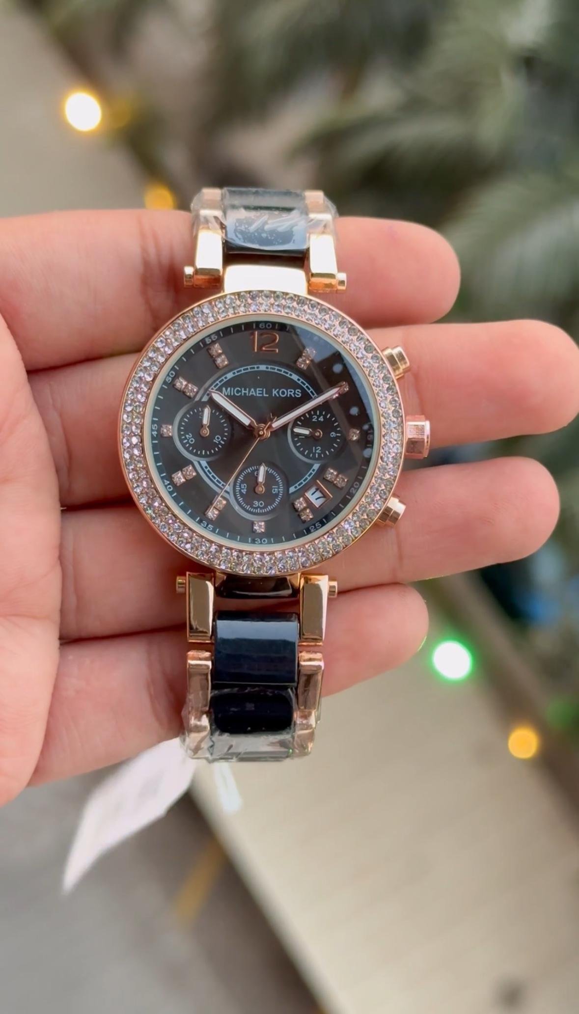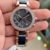 This women’s chronograph watch from the Parker series of MICHAEL Michael Kors exudes elegance and sophistication. The black dial features three sub-dials, crystal hour markings, and three luminous hands, along with a date panel for added functionality. Encased in a sleek black stainless steel case with a crystal-embellished bezel, it is complemented by a black stainless steel three-link bracelet, secured with a deployant clasp. The timeless black design of this watch is sure to make a statement. The weight of this piece is 101 gms, the case thickness is 12 mm, and the inner circumference is 175+/- 5 mm.